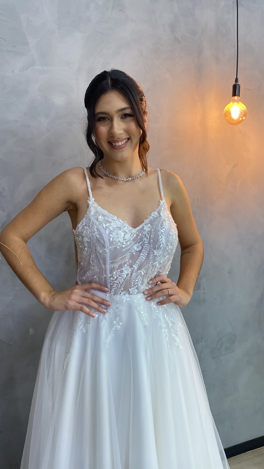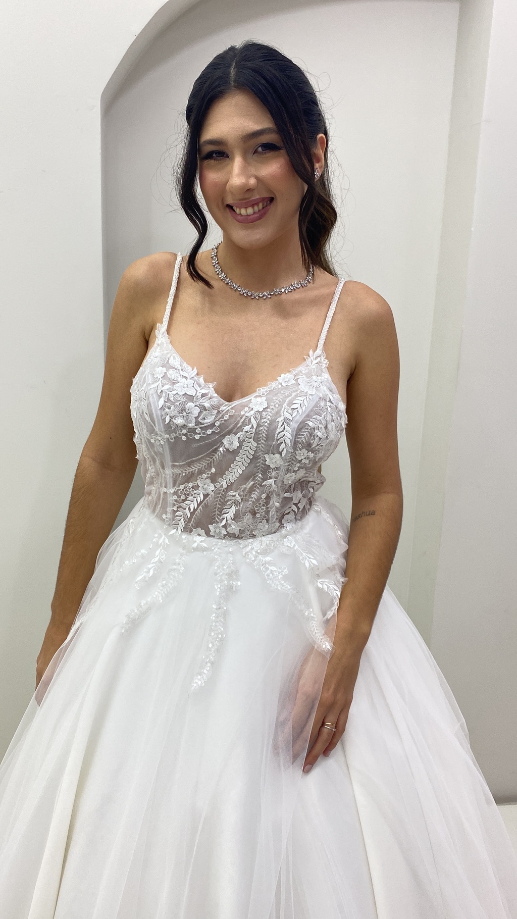 - Corpo de tule branco bordado com renda off white de paete e tule ilusion nas laterais sem bordado.
