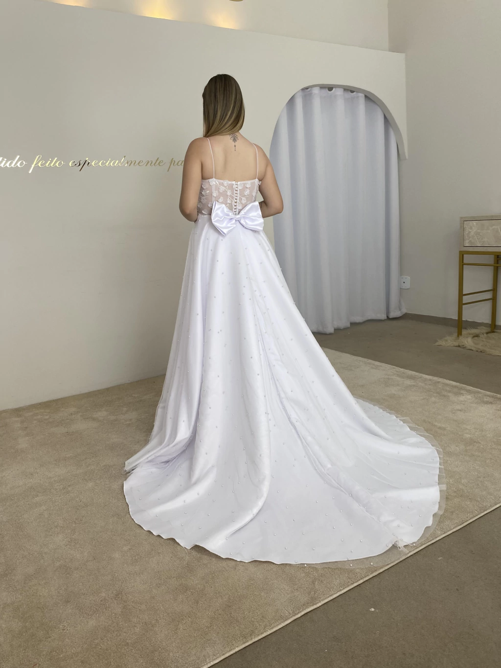 - Tecidos: Bucol, tule de pérolas, tule branco e cetim.