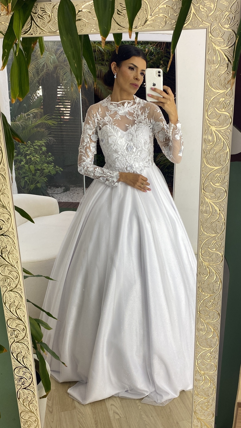 - Corpo decote coração, gola alta bordado em renda no tule ilusion branco e manga longa.