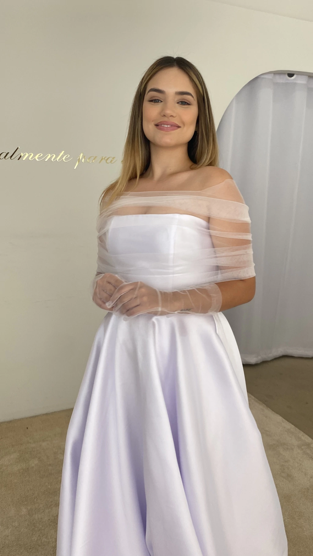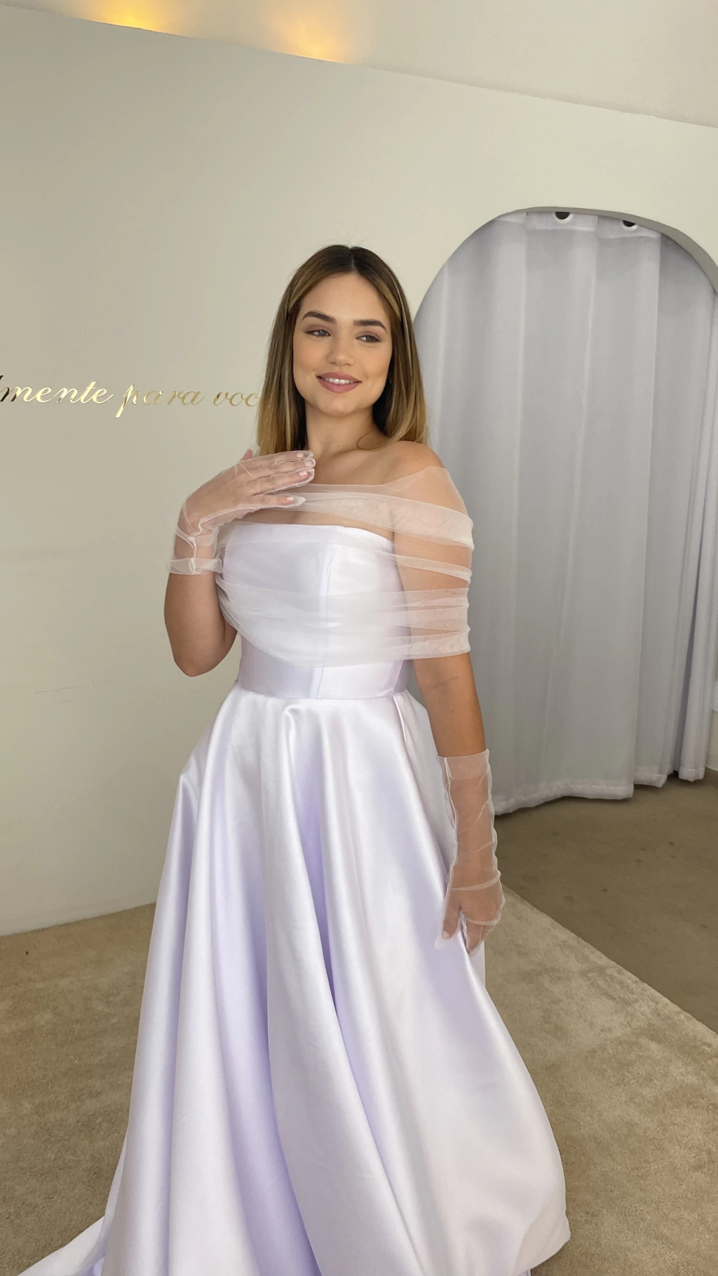 - Modelo tomara que caia, decote reto com pala e luva de tule.